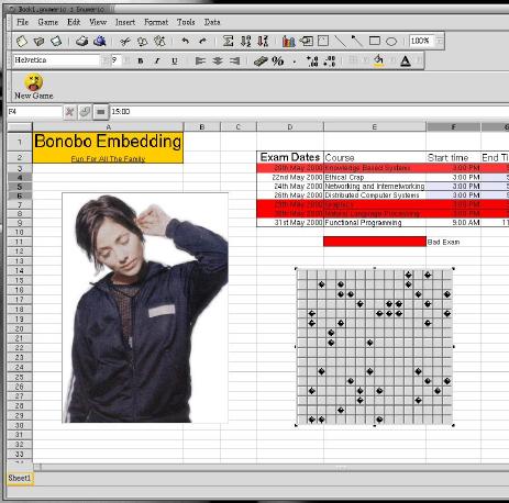 Part of one of the screenshots at GNOME's webpage. It shows miscellaneous embedding (for example, playing GnoMines on the spreadsheet...).